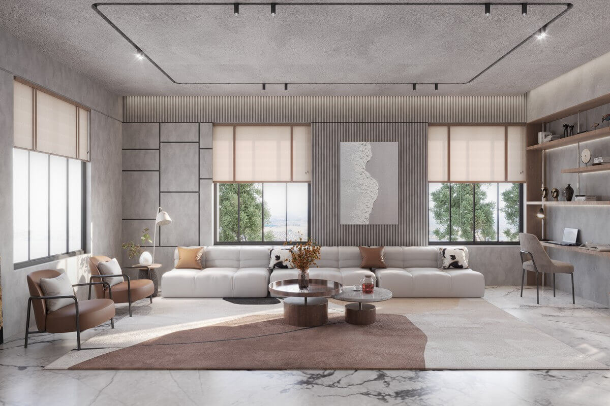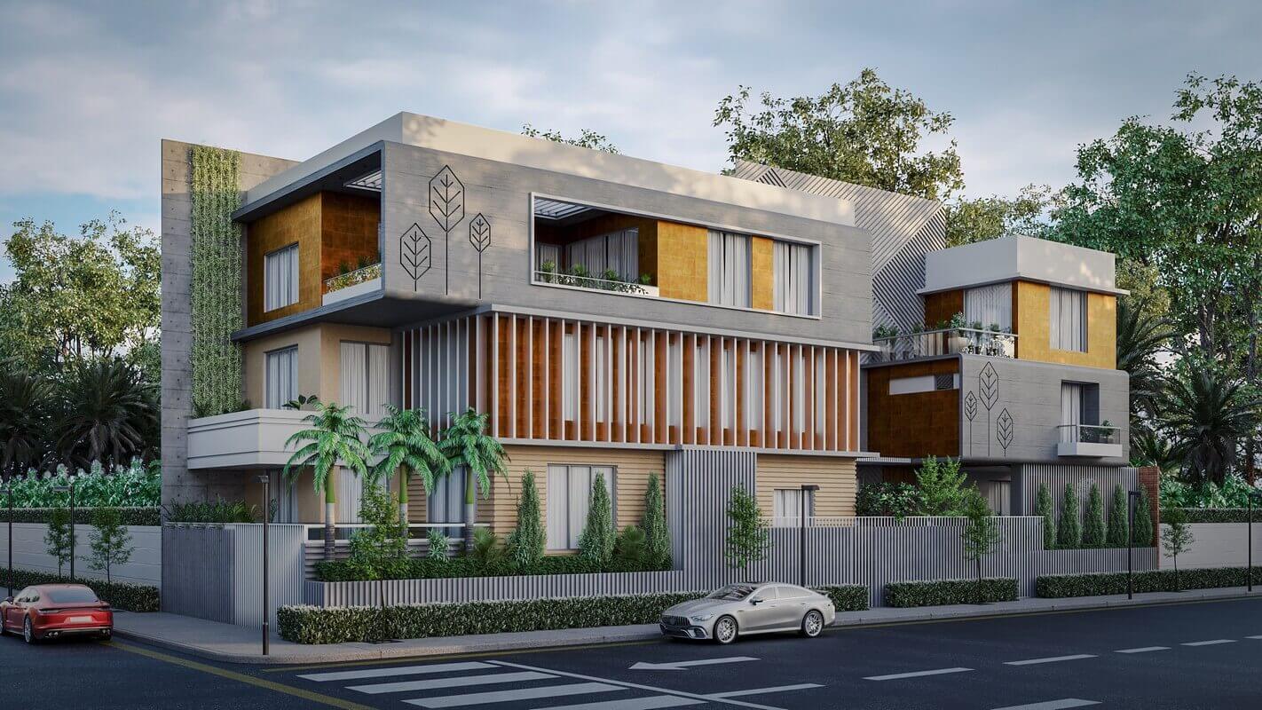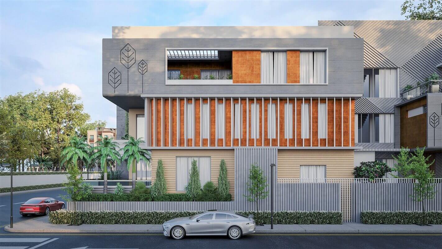 The architectural expression of the house is defined by a bold and layered façade, where materials and volumes come together in a carefully curated composition. Raw concrete panels finished with textured paint, corten steel inserts, and vertical aluminum louvers define the exterior language — robust, refined, and lowmaintenance. This façade reads not as a monolith but as a rhythm of volumes — some pushed, some pulled — creating an ever-changing play of light and shadow that breaks the horizontality of the site.