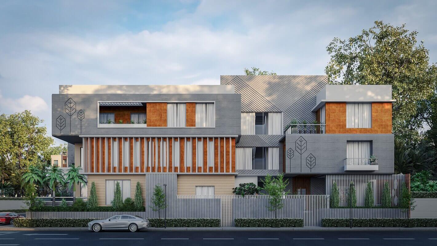 The articulation introduces depth and contrast, while vertical elements like corten steel panels and full-height voids interrupt the linear spread, allowing natural light to filter in and reinforcing the vertical hierarchy. These components also function passively — enhancing privacy, controlling daylight, and improving indoor thermal comfort.