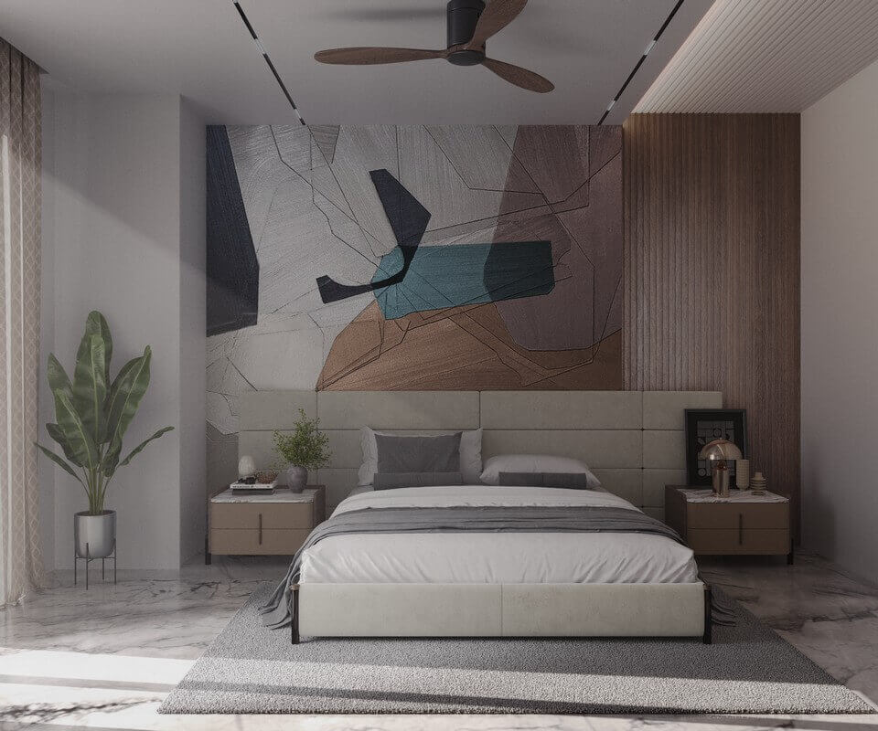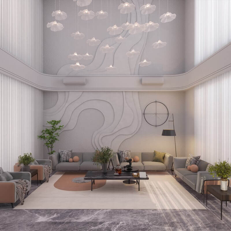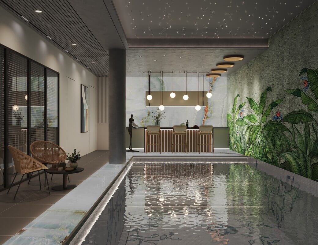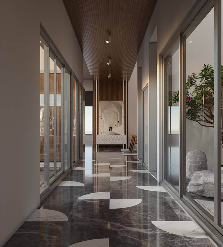 Internally, the residence is organized around a central, triple-height courtyard that forms the spatial and climatic core of the home. Upon entry, this vertical volume immediately opens up, drawing the eye upward and allowing light to pour in from above. Acting as a thermal anchor, the courtyard connects all levels — with bridges, and circulation paths designed around it — encouraging interaction while preserving privacy. The spatial progression flows seamlessly, with each courtyard positioned to punctuate the plan, allowing light and air to filter through and dissolving the rigid linearity of the site.