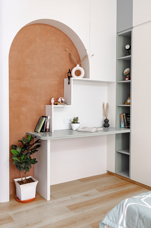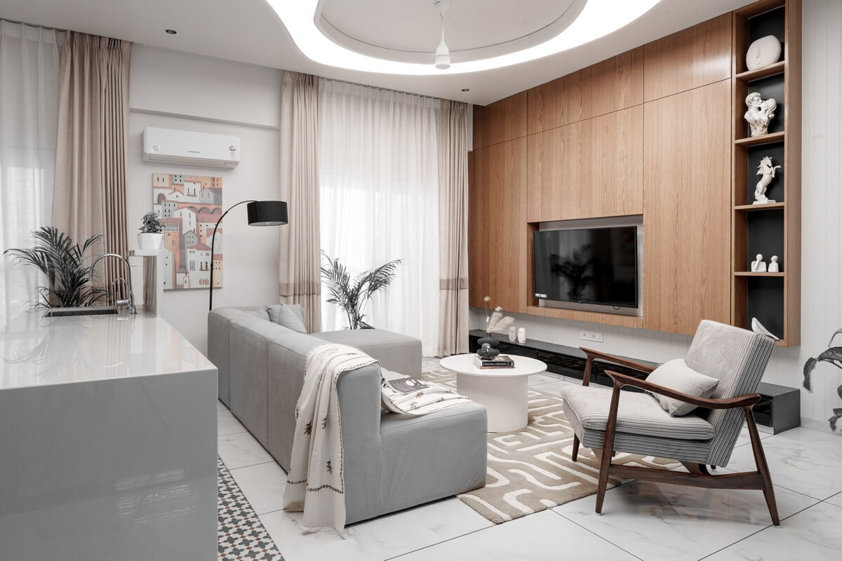 To create a sophisticated yet calming environment, the design adheres to a neutral palette, with soft tones of beige, light grays, and whites as the base. However, this muted backdrop is elevated with the inclusion of carefully selected veneers, which infuse the home with rich texture and depth. This contrast between the neutrality of the palette and the organic textures of wood veneer adds a layer of character, breaking the monotony and ensuring that the home feels lived-in, personal, and thoughtfully designed.