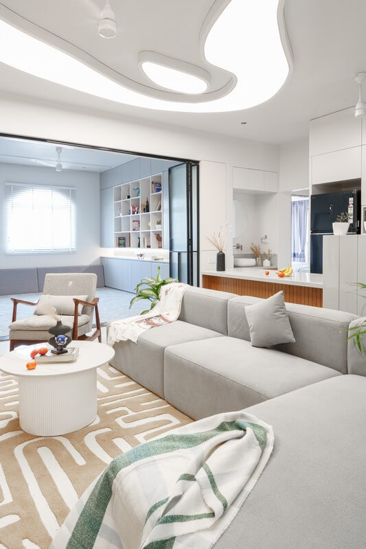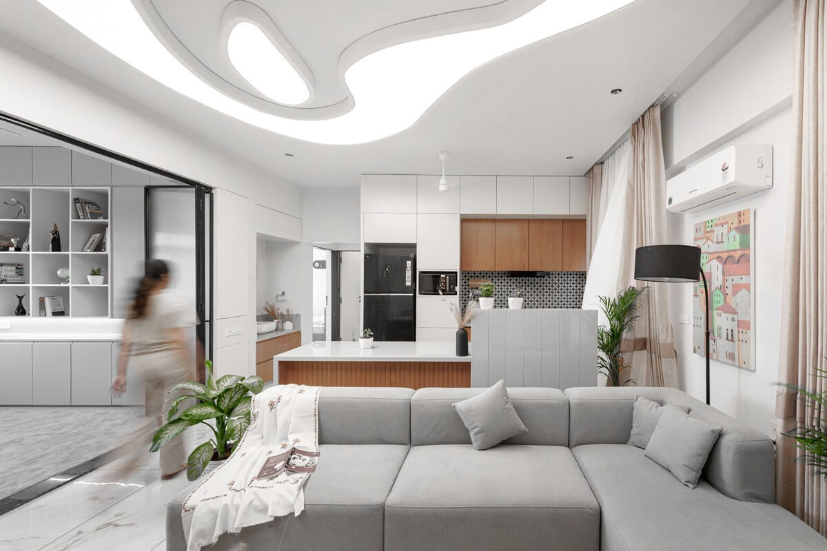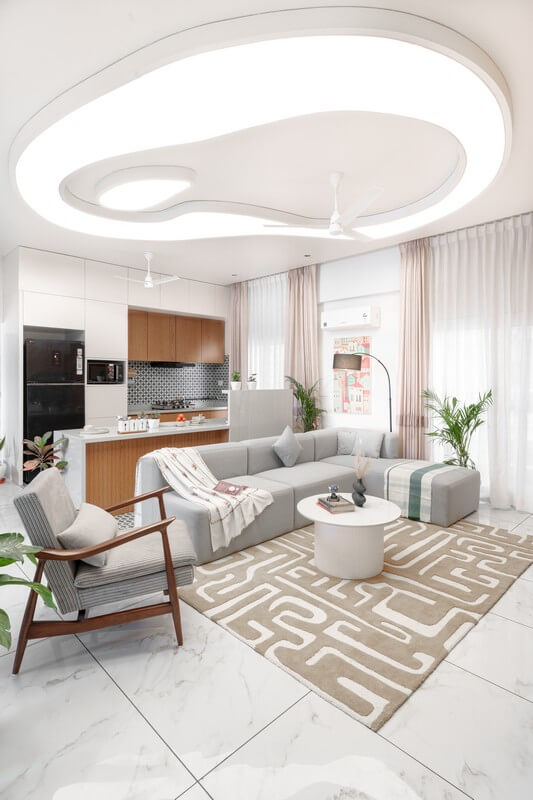 The design of this apartment masterfully integrates both fabric lighting and natural light, creating a harmonious and dynamic environment. A primary focus is the use of fabric lighting within the living room, which serves as both a functional and artistic feature. This soft, diffused light unites the individual spaces, creating a cohesive lighting atmosphere that flows seamlessly through the open-plan layout. The fabric light acts as a guiding thread that connects the living room, dining area, kitchen, and Indian seating, promoting a tranquil ambiance that invites conversation and relaxation.