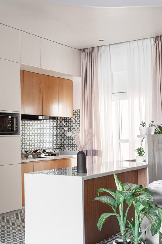 In addition, the apartment is flooded with natural light throughout the day. The soft daylight pours into the living room, enhancing the fabric lighting and bathing the neutral walls in a warm glow. As the natural light penetrates deeper into the interior, it creates dynamic shadows and reflections that evolve with the changing daylight. This interplay of natural and artificial light not only brings the space to life but also defines the mood and functionality of different areas. The living room, for instance, becomes a vibrant gathering space during the day, while the bedroom, with its softer lighting, offers a peaceful retreat at night.